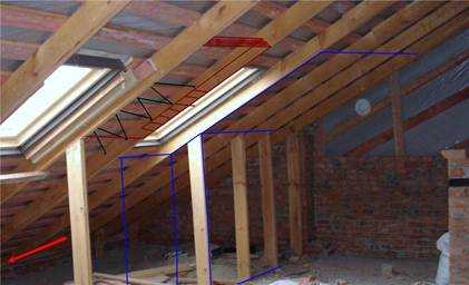 Рассмотрим первый вариант – укладка теплоизоляции между стропилами от конька кровли до перекрытия первого этажа. На рис. 1 красным отмечена область нанесения утеплителя. Помните, что нужно утеплить не только мансарду, а и небольшой отрезок перекрытия первого этажа, который помечен зеленым цветом. Как видите, этот вариант решает сразу обе задачи. Методика монтажа (слои изнутри):