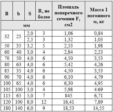 где t — толщина полок; А — ширина большей полки; B — ширина меньшей полки; ρ — плотность материала; rвнешн— радиус внешнего закругления полок; rвнутр— радиус внутреннего закругления.