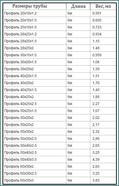 Все перечисленные данные давным-давно сведены в единые таблицы. Т.е. не надо рыться в справочниках и ломать голову, достаточно посмотреть в сводную таблицу, чтобы подобрать потребное поперечное сечение профильной трубы и узнать ее вес.
