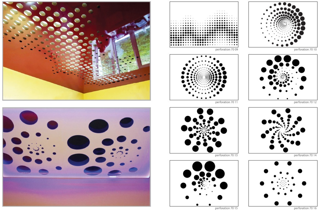 Потолки натяжные перфорированные могут быть любой фактуры и цвета. Его равномерно размещают по всей площади натяжного потолка с определенным отверстием заданного диаметра.