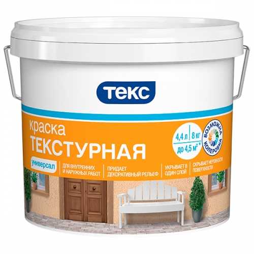 Текстурная краска ТЕКС Универсал, предназначенная для обработки минеральных поверхностей, к которым относятся цементные, кирпичные и бетонные поверхности. Данная марка может использоваться как для наружных, так и для внутренних работ, в том числе и при отделке помещений, характеризующихся повышенной влажностью. Обладает высокой укрывной способностью и наносится в один слой, характеризуясь при этом высокой устойчивостью к перепадам температуры и влажности;