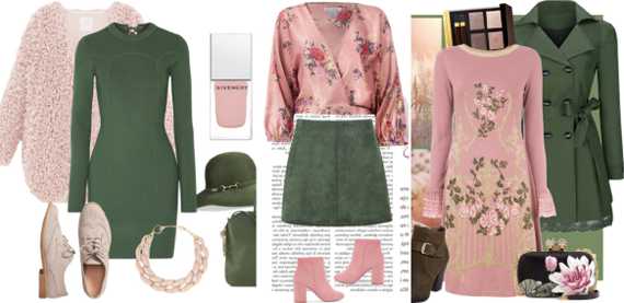 Темный зеленый и розовый – колоритная пара, однако не сильно распространенная. Яркие розовые делают лук пышным и привлекающим внимание, когда сам зеленый располагает к спокойствию. Более выгодными будут приглушенные тона лиловых, бежево-розовых красок.