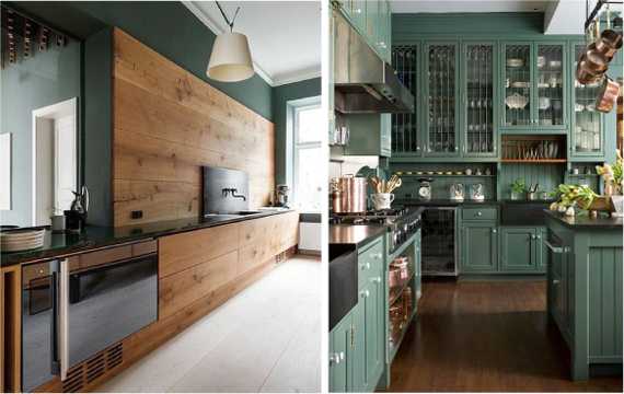 Зеленый – цвет природы, поэтому его сочетание с деревом является наиболее распространенным. И речь идет не только о кухне, когда кухонная мебель выполняется из натурального дерева с сохранением оттенка и выкрашенными в зеленый фасадами, но и о мягкой нежной спальне, прихожей и даже гостиной. В данном вопросе самостоятельно легко создать сочетание зеленого с деревом при оформлении интерьера кухни и прихожей – в прихожей также устанавливается небольшая обувница с вешалкой натурального оттенка дерева. Стены при этом выкрашиваются в зеленую гамму, можно воспользоваться готовыми обоями соответствующего тона.
