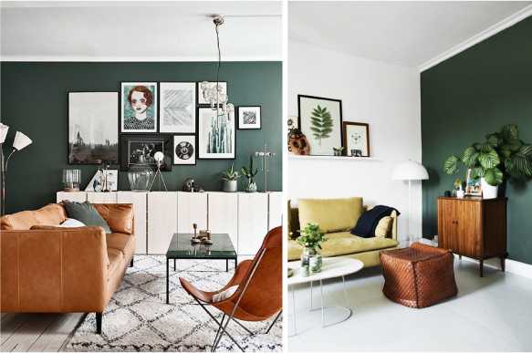 Темно-зеленый цвет добавляет веса в интерьерный дизайн. Это шик и устойчивость традиций, накопленного богатства, спокойствия и уверенности в завтрашнем дне. Поэтому частый спутник темного зеленого – золото, золотисто бежевый, коричневый, темно-синий. Акцентами служат красные, желтые, персиковые тона.