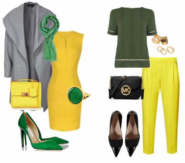 Здесь приветствуется свобода – любые оттеночные сочетания уместны. Будь то ярко-лимонный вязаный свитер и расклешенные брюки темно-малахитового оттенка или желтые брюки с футболкой цвета хаки. Можно поиграть с аксессуарами – очками в желтой оправе, лимонной косметичкой, ярким шейным платком, пластмассовыми объемными браслетами.