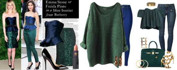Модельеры выделили наиболее выигрышный тандем – сочный синий – цвет королевского сапфира vs. насыщенный зеленый –темный малахит. Это праздничный, шикарный и запоминающийся лук.