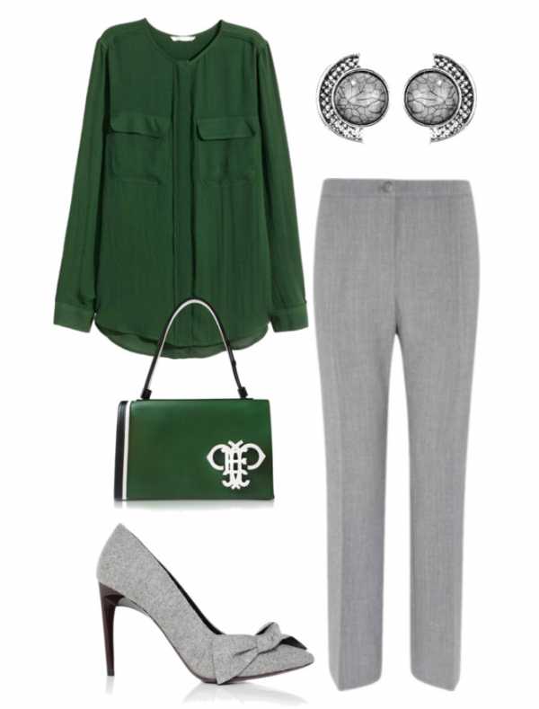 Хорошо в паре с тёмно-зелёным смотрится серый цвет. Только выбирать стоит более светлые его оттенки. Это достаточно консервативное и строгое сочетание прекрасно подойдёт для офисного комплекта. Если же серый заменить серебряным, то получится очень эффектный ансамбль для торжественного мероприятия.