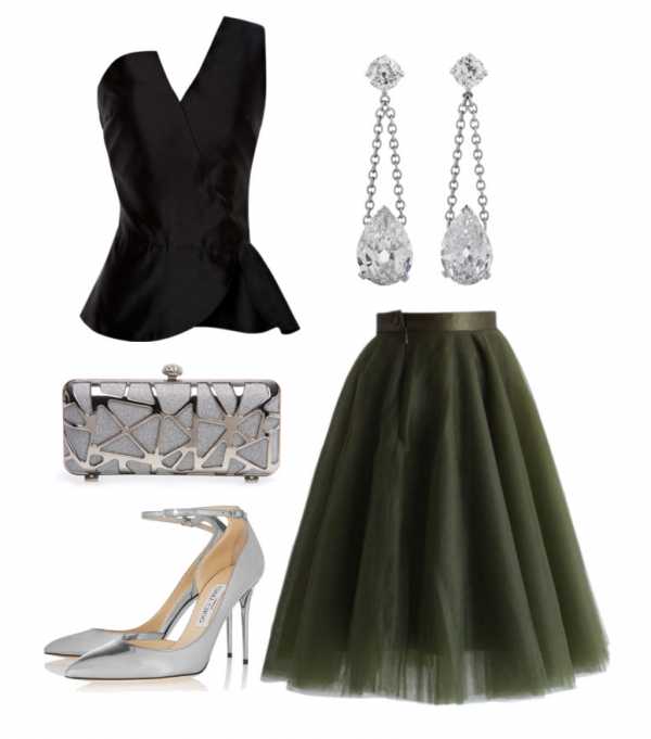 Сочетание чёрного с тёмно-зелёным цветом может выглядеть слишком мрачно, поэтому рекомендуется разбавлять его третьим, более светлым оттенком. Если же дополнить подобный образ сверкающими серебристыми или золотистыми аксессуарами, то получится интересный и яркий ансамбль, подходящий для вечеринки или праздничного вечера.