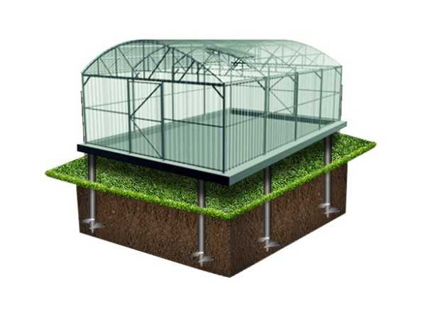 Весьма распространенный способ установки теплицы из поликарбоната, когда мауэрлат крепится на винтовые сваи. Диаметр погружаемой части 32 мм, длина порядка 700 — 1000 мм. Легко выполняется своими руками, из-за чего способ и стал популярным.