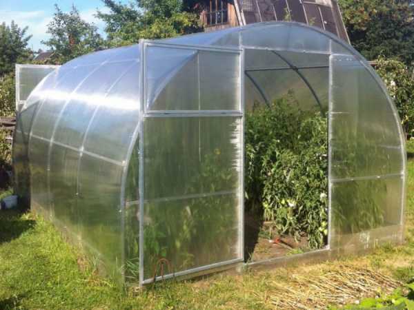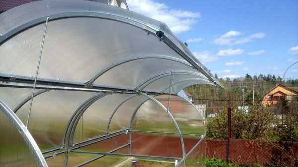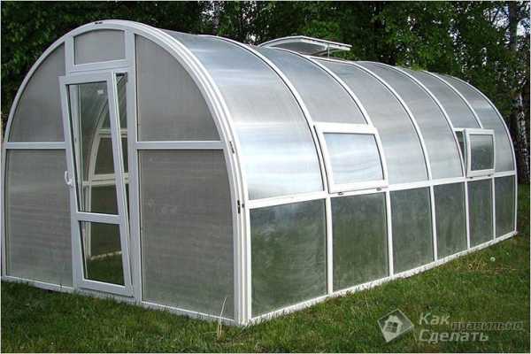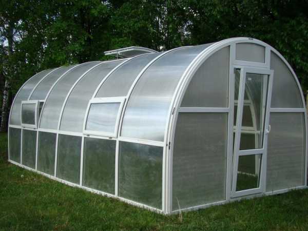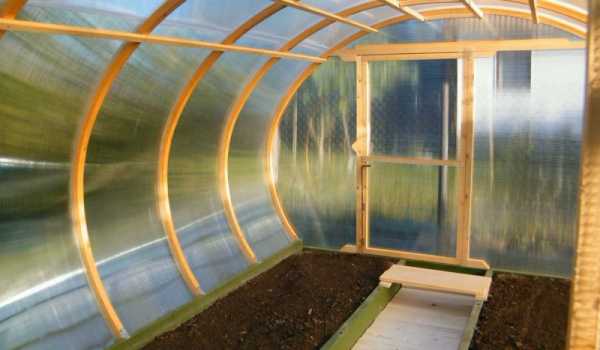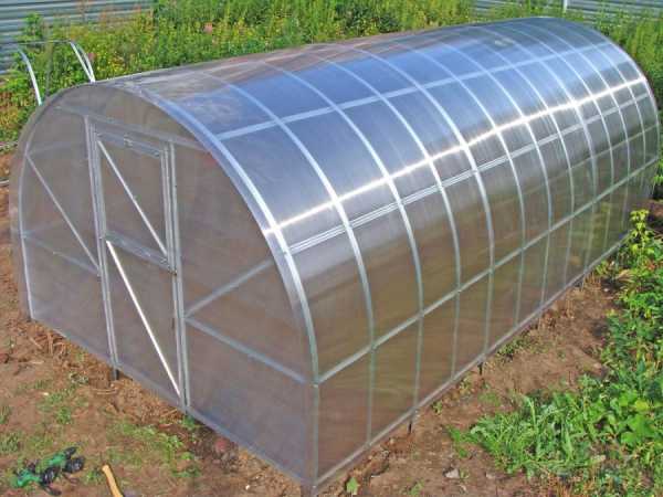 Главным достоинством поликарбоната выступает его легкость и использование подобной теплицы до 10 лет. Возможность сгибания листа под тепличную арку предоставляет существенное увеличение нагрузки от снега. Каркас обычно применяется металлический. От размеров поликарбонатного листа зависят размеры стенок парника и длина арок.