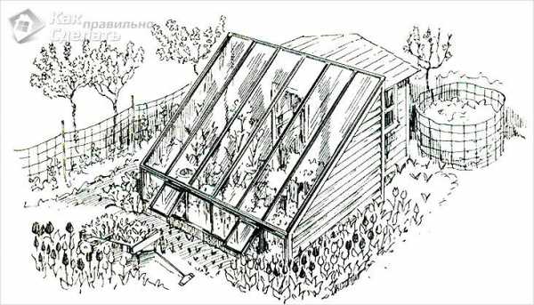- Парник с односкатной крышей представляет собой пристройку к стене дома. Для лучшего солнечного обогрева ее следует устанавливать с западной либо южной стороны постройки. Стена дома в этом случае играет роль силового элемента каркаса, благодаря ей обеспечивается надежная защита от северных ветров.
