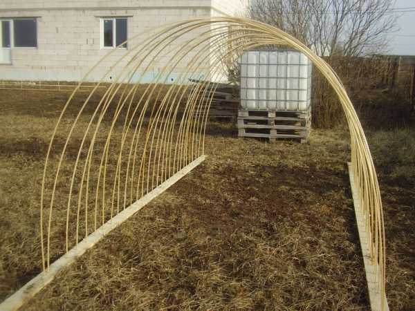 1. Первый этап – подготовка площадки под парник. Площадку следует утрамбовать, по ее периметру сбить доски, предварительно пропитанные антисептическим составом. Это может быть, например, 10-процентный раствор медного купороса. По углам короба укрепляют арматуру.