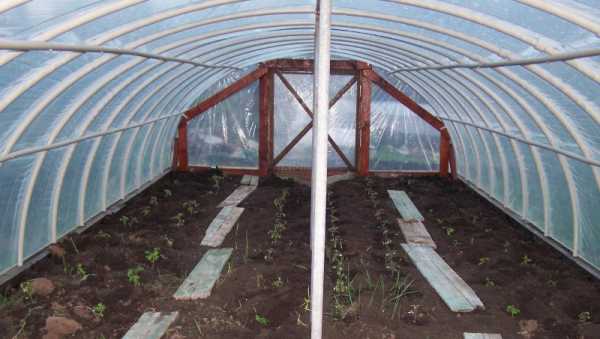 Чтобы удобнее было ухаживать за культурами в парнике, к бортам параллельно почве прибиваются деревянные бруски, на которые укладывают две доски толщиной 3 см. На эти доски можно опираться во время работы.