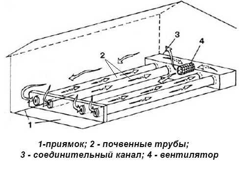 По трубам из асбеста диаметром 100—200 мм движется воздух, побуждаемый маломощным вентилятором, установленном в общем коллекторе. Днем тепло от воздуха через стенки труб передается глиняной подушке, а ночью грядки получают от нее тепло. Для повышения эффективности под глину следует поместить теплоизоляционный материал, например, пенопласт.