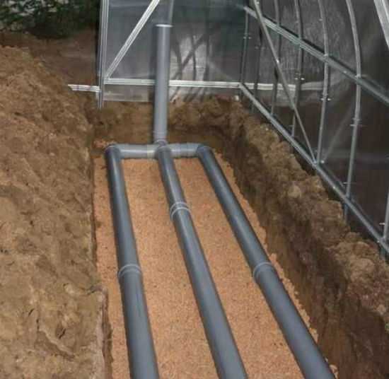 Для контуров можно применять как стальные, так и полимерные трубы, предназначенные для отопления. Чтобы пластмассовые трубы не были повреждены в процессе эксплуатации, их нужно защитить специальной сеткой, после чего сверху насыпается плодородный грунт для выращивания растений. Выведенные наружу патрубки можно присоединить к общему коллектору, проходящему вдоль всей теплицы, как это сделано на фото: