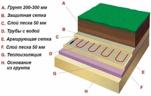 Водяной подогрев используется с применением специальных труб из полимерного материала, которые прокладываются под грунтом.