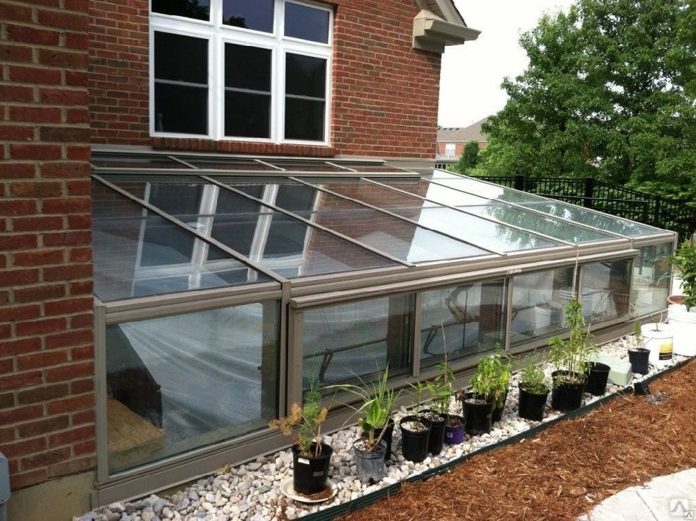 Односкатные виды отличаются небольшим размером. Зачастую их пристраивают к стене дома, чтобы организовать там зимний сад.