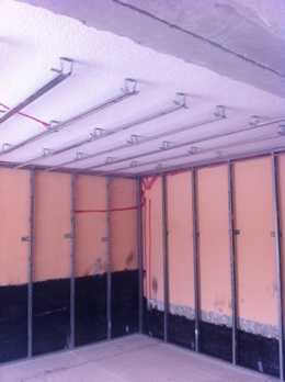 Затем на стены, с помощью строительного уровня, вертикально устанавливаются металлические направляющие профили на расстоянии 40 — 60 см. друг от друга. Крепить профиль прямо к стене не следует. Нужно отступить, так, чтобы под него можно было подложить звукоизоляцию.