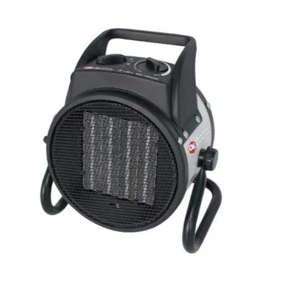 Это электрическая тепловая пушка с керамическим нагревательным элементом. У нее два уровня мощности — 1 и 2 квт., этого достаточно для того, чтобы увеличить температуру в комнате 20 кв. метров, на 43 градуса. Сама пушка весит всего 3,5 килограмма, поэтому ее можно легко переносить между помещениями. Модель подходит для того, чтобы обогревать небольшие жилые помещения, потому что она безопасна, компактна и удобна для использования.