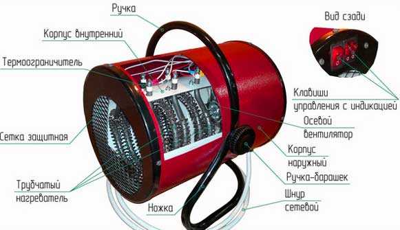 Конструктивно тепловая пушка состоит из нагревательного элемента и вентилятора. Нагрев ТЭНа осуществляется за счет электрической энергии, энергии сгорания жидкого топлива или газа. В процессе работы вентилятор тепловой пушки создает мощный поток воздуха, который обдувает нагревательный элемент и в процессе нагревается. Благодаря такой конструкции обогрев помещения осуществляется достаточно быстро и с минимальными энергозатратами.