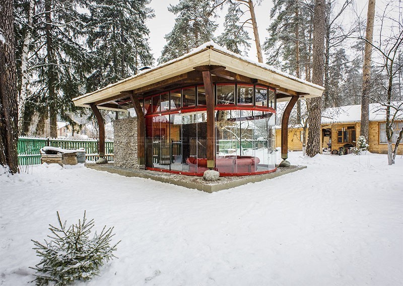 - Зимний домик с камином – по сути, отдельно стоящая гостиная с очагом. Здесь можно провести приятный вечер, организовать посиделки и даже оставить на ночь гостей. По такому типу часто создают гостевые домики на реках и озерах – например, на озере Шарташ.