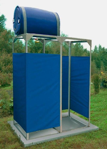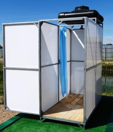 Летний душ открытого исполнения представляет собой каркасно-разборный блок либо модульный контейнер, одна из стенок которого примыкает к основной постройке