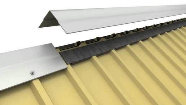 После завершения монтажа профнастила, на коньковом участке крепят профиль, закрывающий стык скатов. Для исключения попадания дождевой воды под крышу под коньковый профиль ставят уплотнительную ленту.