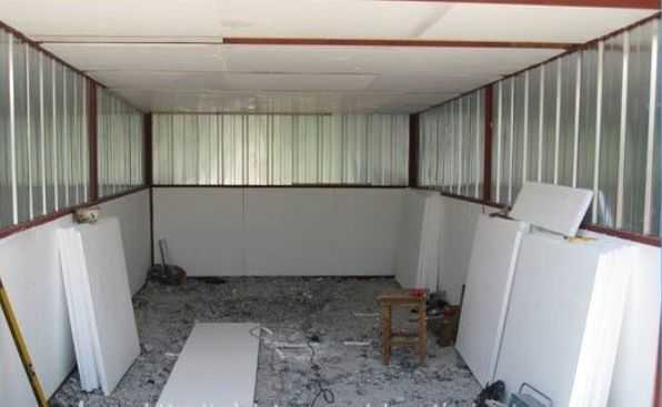 От дискомфорта, вызванного сильным нагревом металла летом и зимнего холода в гараже можно избавиться, утеплив каркас. Проще всего выполнить эту работу, используя пенопласт. Толщины листа в 40 мм будет достаточно для утепления и размещения между стойками каркаса. Пенопласт не пропускает водяной пар. Это негативное качество материала в нашем случае становится преимуществом, избавляя от необходимости использовать пароизоляцию.