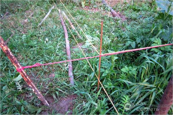 На выбранном участке вбивают 4 колышка, обозначая углы гаража. Между ними натягивают строительный шнур, выделяя контур по которому будет бетонироваться фундамент.