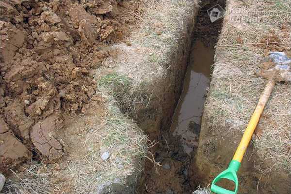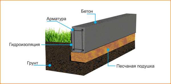 - По шнуру выкапывают траншею шириной 300–400 мм и глубиной 500 мм. По углам бурят ямы для основных опор. Их глубина от фундамента больше на 300 мм. Внутрь ямок насыпают 100 мм слой песка со щебнем, устанавливают по уровню опоры и заливают их бетоном.