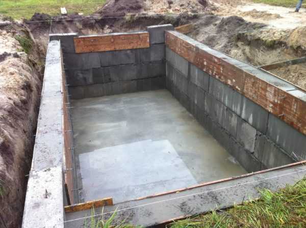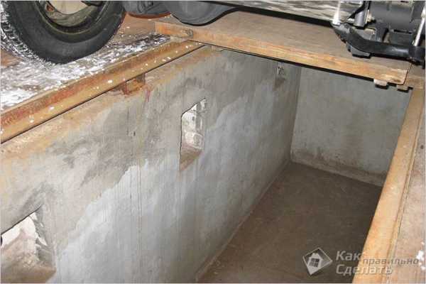 - Вначале бетонируют дно смотровой ямы. Затем возводят ее стены из шлакоблока так, чтобы они выступали 100 мм над уровнем уложенной на пол гаража гидроизоляции.