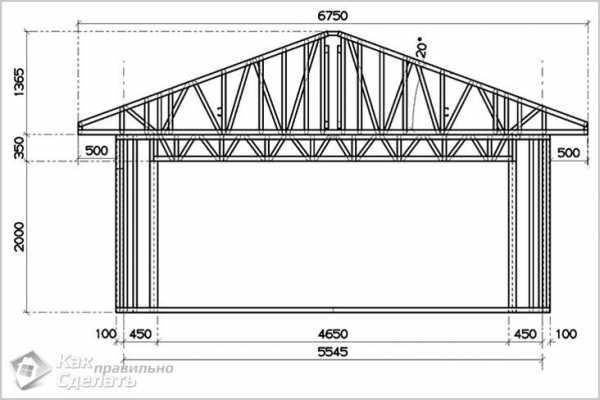 Ферма для двускатной крыши гаража сваривается на земле на ровной площадке. Сделайте дин шаблон, проверьте правильность конструкции. Если все верно, то по этому шаблону можно сваривать остальные элементы крыши. На такой гараж понадобится 6 ферм. Угол наклона двускатной крыши гаража не менее 20°, но конкретное решение принимается с учетом климатической зоны расположения гаража.