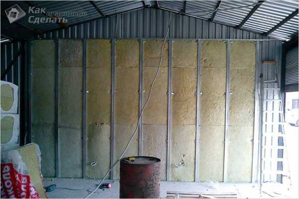 - Минеральная вата. Уже упоминалось, что этот материал очень боится влаги, мокрая вата отлично проводит тепло, эффективность утепления почти нулевая, кровельный профлист холодный. Есть еще одна проблема с ватой. Это тяжелый материал, крепить его нужно специальными металлическими дюбелями к прочной поверхности. В гараже для внутренней обшивки применяются плиты ОСП, а они не могут держать таких нагрузок – не позволяет малая толщина. Если прессованную вату не зафиксировать прочно, то со временем она обязательно даст усадку, а это также негативно влияет на показатели теплосбережения. Вывод – минеральную вату для утепления гаражей из металлопрофиля использовать категорически не рекомендуется.