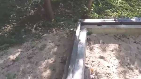 - Вокруг траншеи выстраивают опалубок, ее дно засыпают 100 мм слоем щебня и укладывают армирующую сетку. На углах пруты сетки приваривают к стойкам, после чего заливают траншею бетоном.