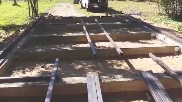 - На нижнюю обвязку каркаса настилают балки перекрытия, а затем настилают дощатый пол. Пиломатериалы выбирают с учетом веса автомобиля.
