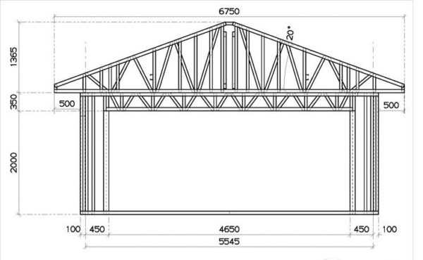 Изображая каркас, необходимо указать все вертикальные стойки. В первую очередь отображают угловые опоры, а затем промежуточные с расчетом расстояния между ними 700–800 мм. Для жесткости каркаса на схеме надо нарисовать расположение распоров по углам. - Третий чертеж – это кровля. Для гаража можно построить односкатную или двускатую крышу. Схему первого вида можно отобразить на общем чертеже всей постройки из-за ее простоты. Чертеж двускатной конструкции лучше нарисовать отдельно. Здесь надо учесть минимальный ее уклон 30о и 3 поперечные балки длиной равной ширине постройки. Они нужны для установки вертикальных стоек, образующих конек крыши.