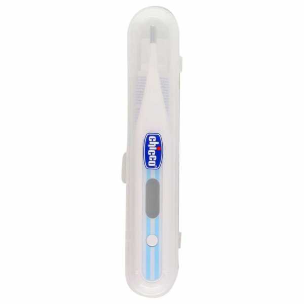 - Chicco Digi light. Детский градусник обладает ярким внешним видом и гибким носиком, на конце которого размещается датчик. Плюсом данного оборудования является встроенная подсветка дисплея, а также звуковой сигнал. Кроме этого, у прибора в комплекте идет защитный футляр.