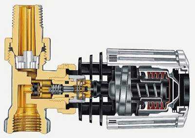 Автоматический термостат представляет собой специальный клапан, автоматически связанный с термической головкой. Она обладает высокой чувствительностью и состоит из: