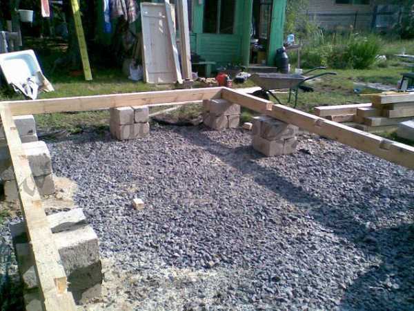 - Вылейте половину цемента на щебень, положите арматуру, залейте оставшимся цементом.