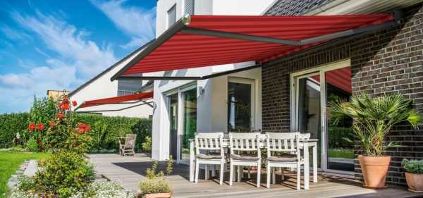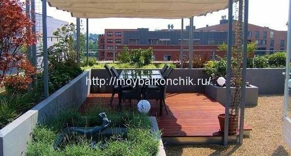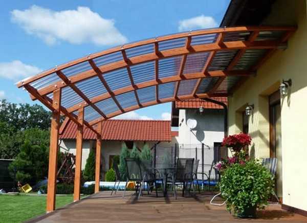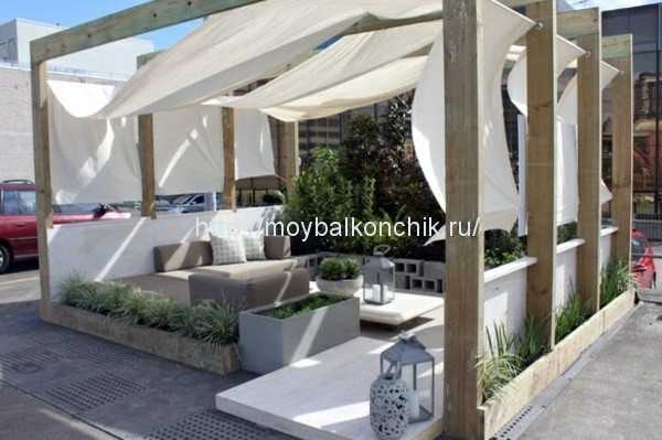 Очень часто терраса оборудована навесом или тентом, которая защищает ее от прямых солнечных лучей в жаркий летний день.