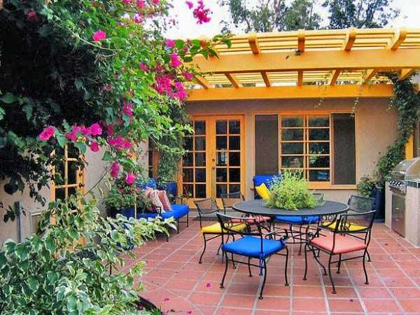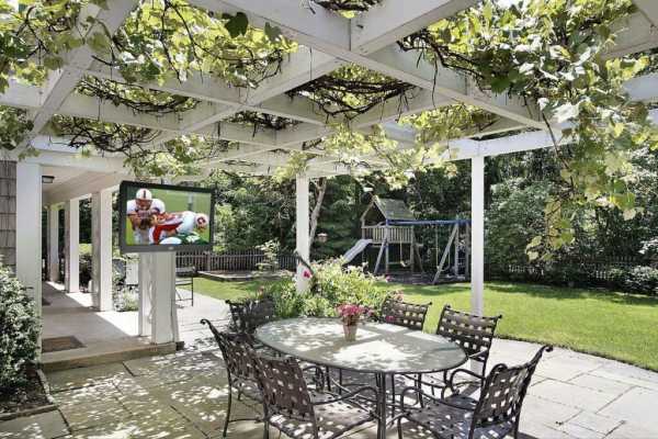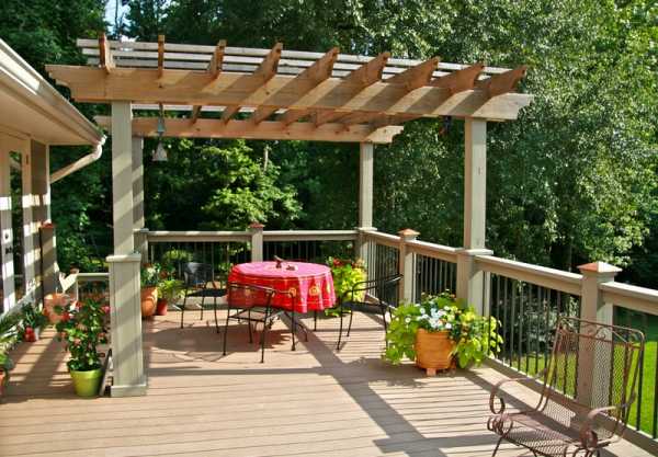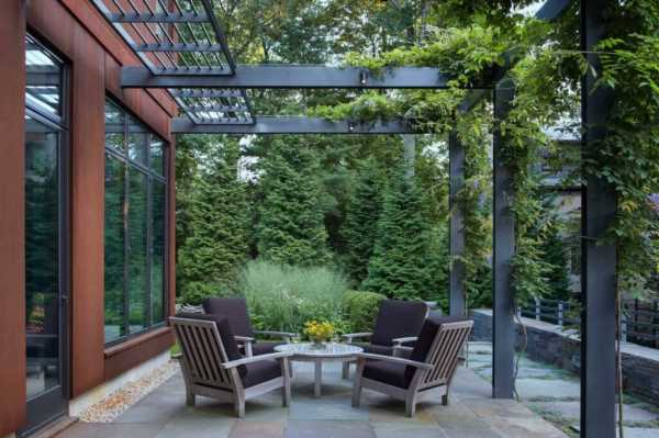 Террасы-перголы представляют собой решетчатую конструкцию крыши, которую обвивают растения. Находиться на такой террасе – одно удовольствие: мягкий свет сквозь листья растений, ажурные тени и ароматы цветов. Однако мебель в такой террасе на ночь лучше не оставлять.