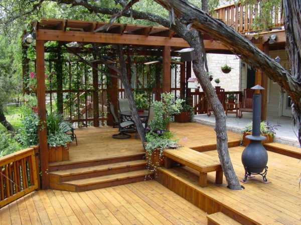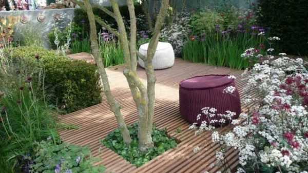 Тенистая терраса в саду. Высокая терраса расположена в тени старых деревьев. Красивую форму террасы подчеркивают встроенные скамьи. И особое очарование ей придает большое дерево, которое растет сквозь настил.