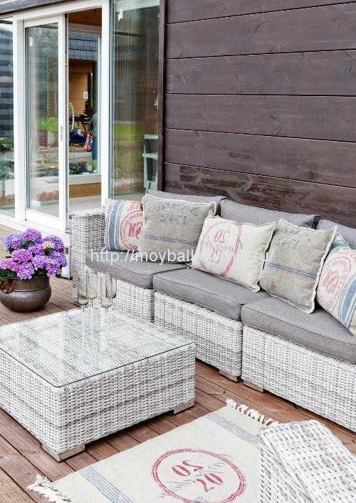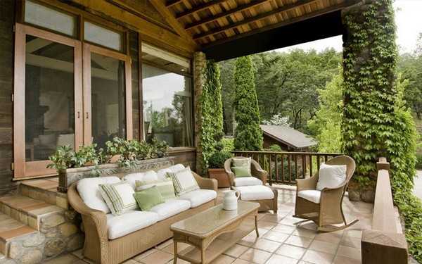 Имея большую веранду или террасу, рационально разделить ее на несколько зон, например, для приема гостей и семейного отдыха. С одной стороны можно поставить прочную мебель из ротанга, светлого цвета со специальными мягкими подушками. Причем журнальные столики выполнены из того же материала.