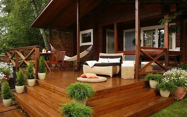 Выбор строительных материалов для веранды — ответственный этап строительства, ведь от него будет зависеть долговечность строения. Отделочные материалы должны сочетаться не только с самим домом, но и с окружающей средой. В настоящее время выбор материалов очень велик. Можно выбрать металл, бетон, кирпич, камень, но все же самым популярным считается дерево. Чаще всего уютная терраса ассоциируется именно с деревянным строением. Но стоит иметь в виду, что материал обязательно должен быть обработан специальными составами, которые повысят влагоустойчивость и долговечность древесины. Для постройки террас обычно выбирают древесину лиственницы, кедра, ели и дуба.
