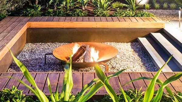 Маленькая терраса с мангалом. Терраса расположена с задней стороны дома, в тихом уголке сада. Настил террасы служит одновременно и скамейками, на которых удобно сидеть у живого огня.