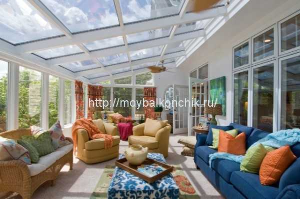 А если пол и стены террасы или веранды оформлен деревом, а мебель светлого цвета, то такое помещение выглядит по-домашнему уютно. Добавит привлекательности и белый ковер, и декоративные подушки с чехлами из светлого рельефного атласа.