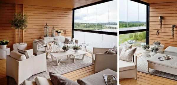 Создать уютное пространство интерьера террасы поможет правильная мебель – удобные кресла с деревянным каркасом и мягкими подушками, хлопчатобумажным светлым ковром.