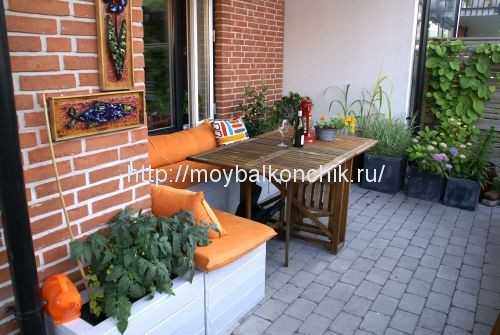 На большом балконе можно красиво оформить интерьер террасы: для посадочных мест рекомендуется использовать обычные деревянные лавочки, дополнив их мягкими подушками, или декоративными шкурами животных.