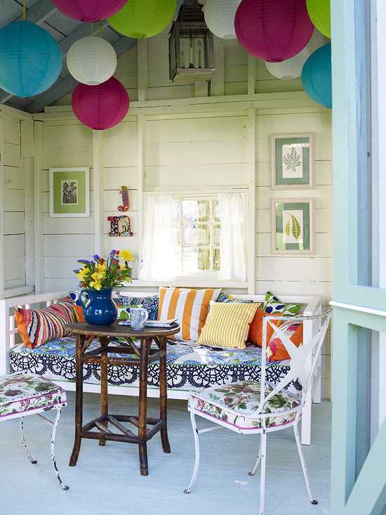 И пусть вас не смущает то, что в исходном примере терраса выглядит как павильон, ограниченный изумительными решетками. Последние, конечно, вносят свой вклад в создание впечатляющего облика, но атмосферу все-таки создают именно детали — те, что добавлены специально ради летнего отдыха. Вдохновляясь ими, можно создать красивую террасу из предметов, которые уже имеются в вашем доме или легко приобрести в магазинах за весьма умеренную цену.
