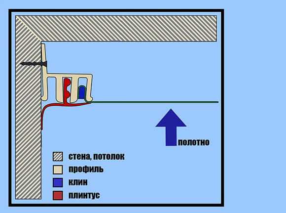- В специальный профиль, который можно крепить и на стенах, и на потолке, предварительно повешенное полотно закрепляется при помощи специальных пластиковых клиньев.